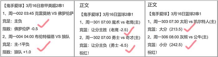 公推19中17周一冲3连红,足篮收7个2串1,单场两组优收一个3串1!