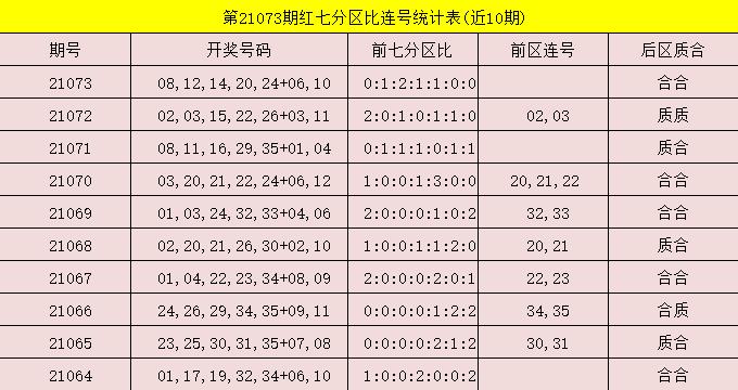 本人的方案近8期推中7期,红的不要不要的。走过路过的朋友千万不要再错过了,大奖就在眼前!大乐透第21073期开奖信息,前区:08,12,14,20,24;后区:06,10。上期未开出连号。
