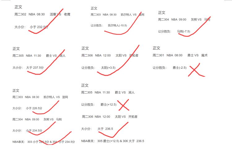 年叔战绩: 公推、私菜 大满贯:NBA8组2串1+足球4组2串1全红