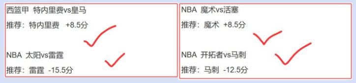 主任篮球昨日两个让分2串1方案全部收入囊中,西篮甲+NBA都在拿捏之中,可惜大小分失手,最终拿下两个让分串关。